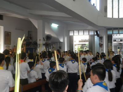 Vào lúc 07g00 cha chính xứ Nam Hòa Giuse Trần Văn Lưu đã chủ sự nghi thức làm phép lá và rước lá khởi đầu của thánh lễ Thiếu nhi để TƯỞNG NIỆM CUỘC THƯƠNG KHÓ CỦA CHÚA.
